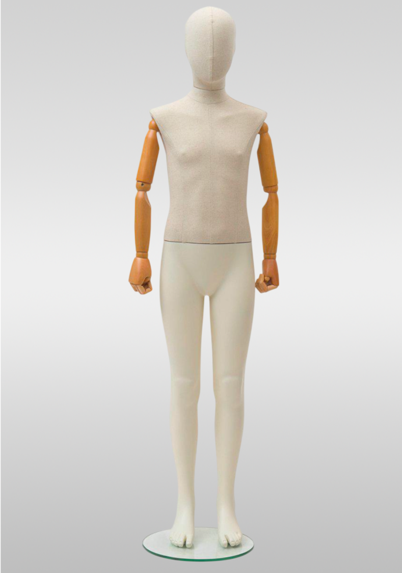 Детский манекен с обтяжкой из льна и деревянными шарнирными руками — стильное решение для магазинов детской одежды и шоурумов. Натуральная льняная обтяжка подчёркивает премиальный внешний вид, а подвижные руки позволяют создавать разные образы.