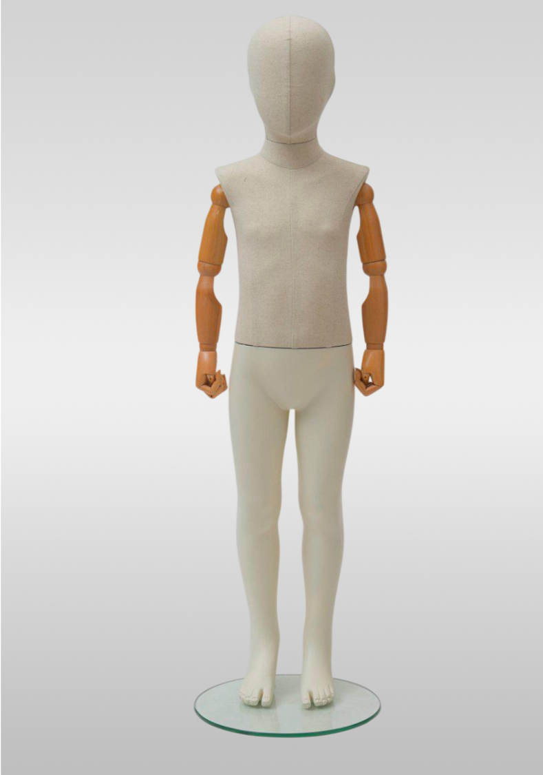 Детский манекен с обтяжкой из льна и деревянными шарнирными руками — стильное решение для магазинов детской одежды и шоурумов. Натуральная льняная обтяжка подчёркивает премиальный внешний вид, а подвижные руки позволяют создавать разные образы.