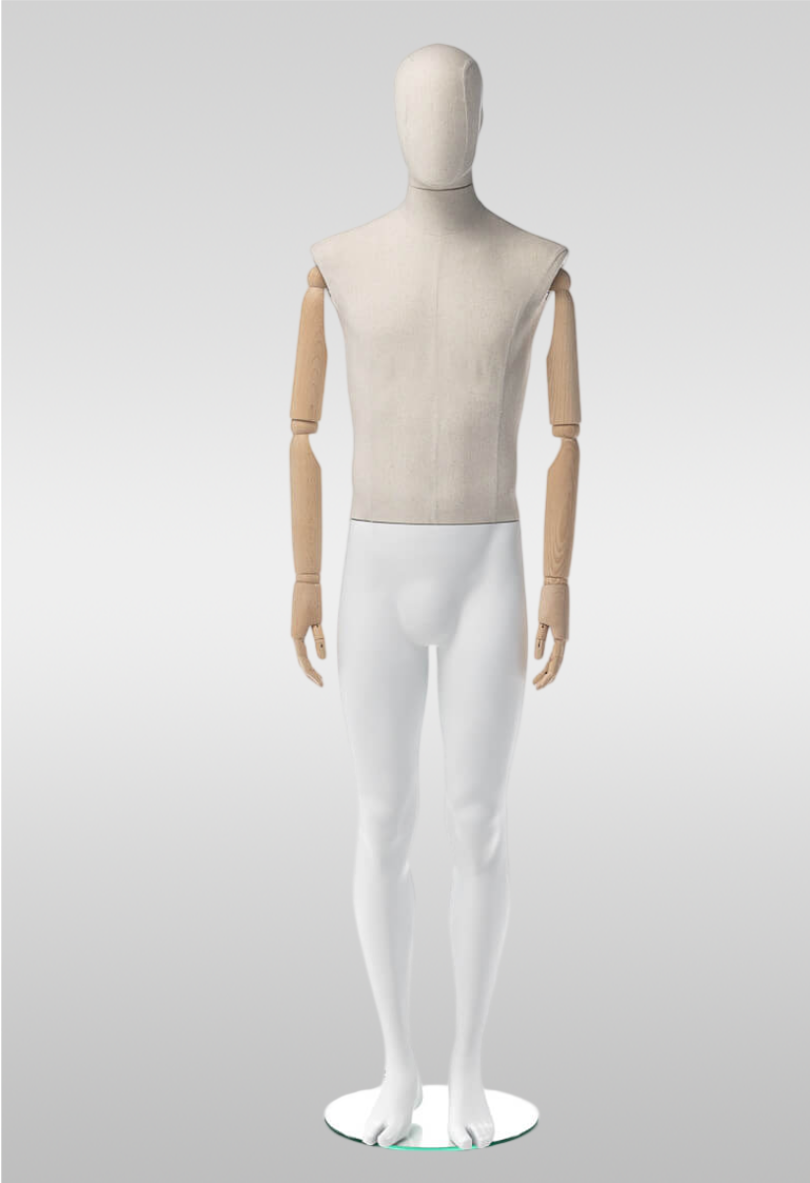 Мужской абстрактный манекен Кевин— для профессиональной демонстрации одежды. Прямая поза обеспечивает аккуратную посадку изделий, включая многослойные образы. Поворотная и съёмная голова упрощает переодевание, возможна установка без головы.