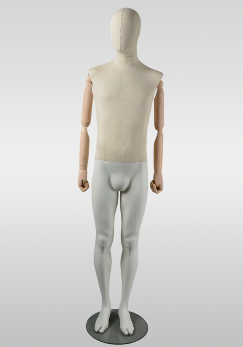 Мужской манекен в винтажном стиле с обтяжкой из льна и деревянными шарнирными руками — стильное решение для бутиков и магазинов одежды. Натуральная льняная обтяжка подчёркивает премиальный характер витрины, а подвижные деревянные руки позволяют создавать выразительные образы.