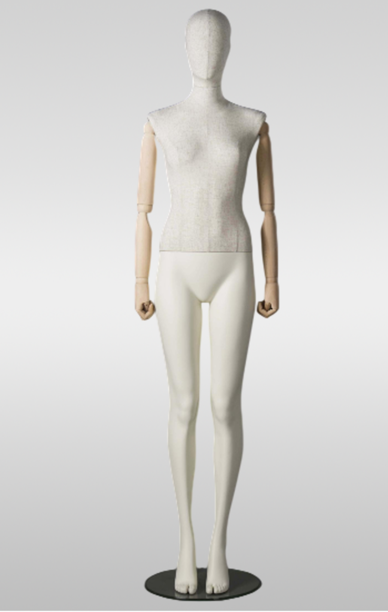 Женский абстрактный манекен для профессиональной демонстрации одежды. Прямая поза обеспечивает аккуратную посадку изделий, включая многослойные образы. Поворотная и съёмная голова упрощает переодевание, возможна установка без головы (есть заглушка для шеи).