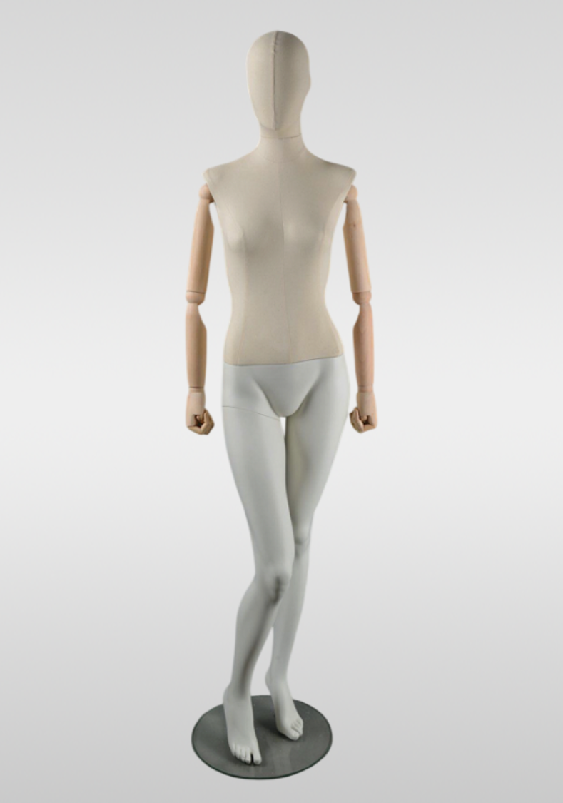Женский абстрактный манекен Винтаж - обтянутый льняной тканью, с подвижными деревянными руками — идеальное решение для магазинов одежды, шоурумов, музеев и витринных экспозиций. Элегантный винтажный образ подчёркивает посадку одежды и аксессуаров, подходит для классических и дизайнерских коллекций.