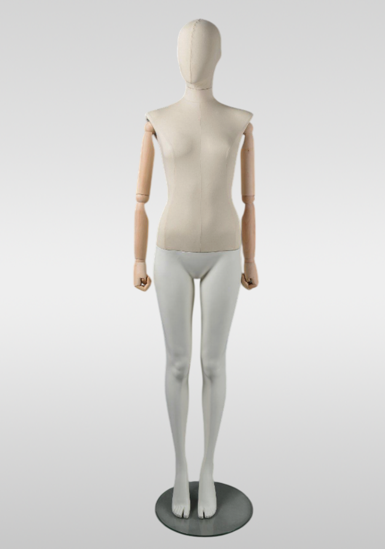 Женский абстрактный манекен Винтаж - обтянутый льняной тканью, с подвижными деревянными руками — идеальное решение для магазинов одежды, шоурумов, музеев и витринных экспозиций. Элегантный винтажный образ подчёркивает посадку одежды и аксессуаров, подходит для классических и дизайнерских коллекций.