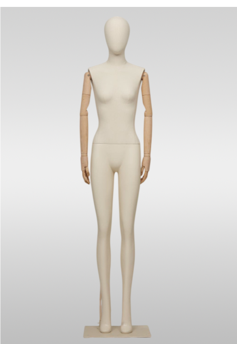 Женский абстрактный манекен Винтаж - обтянутый льняной тканью, с подвижными деревянными руками — идеальное решение для магазинов одежды, шоурумов, музеев и витринных экспозиций. Элегантный винтажный образ подчёркивает посадку одежды и аксессуаров, подходит для классических и дизайнерских коллекций.