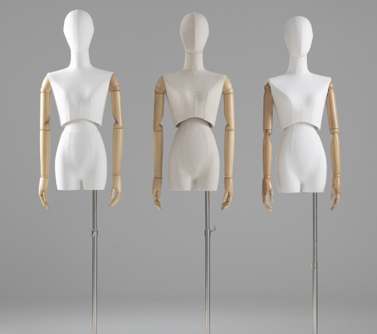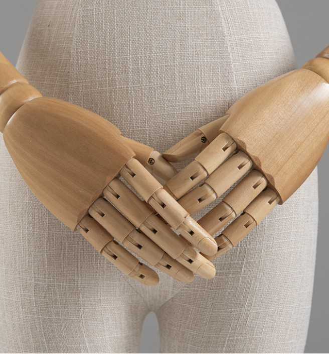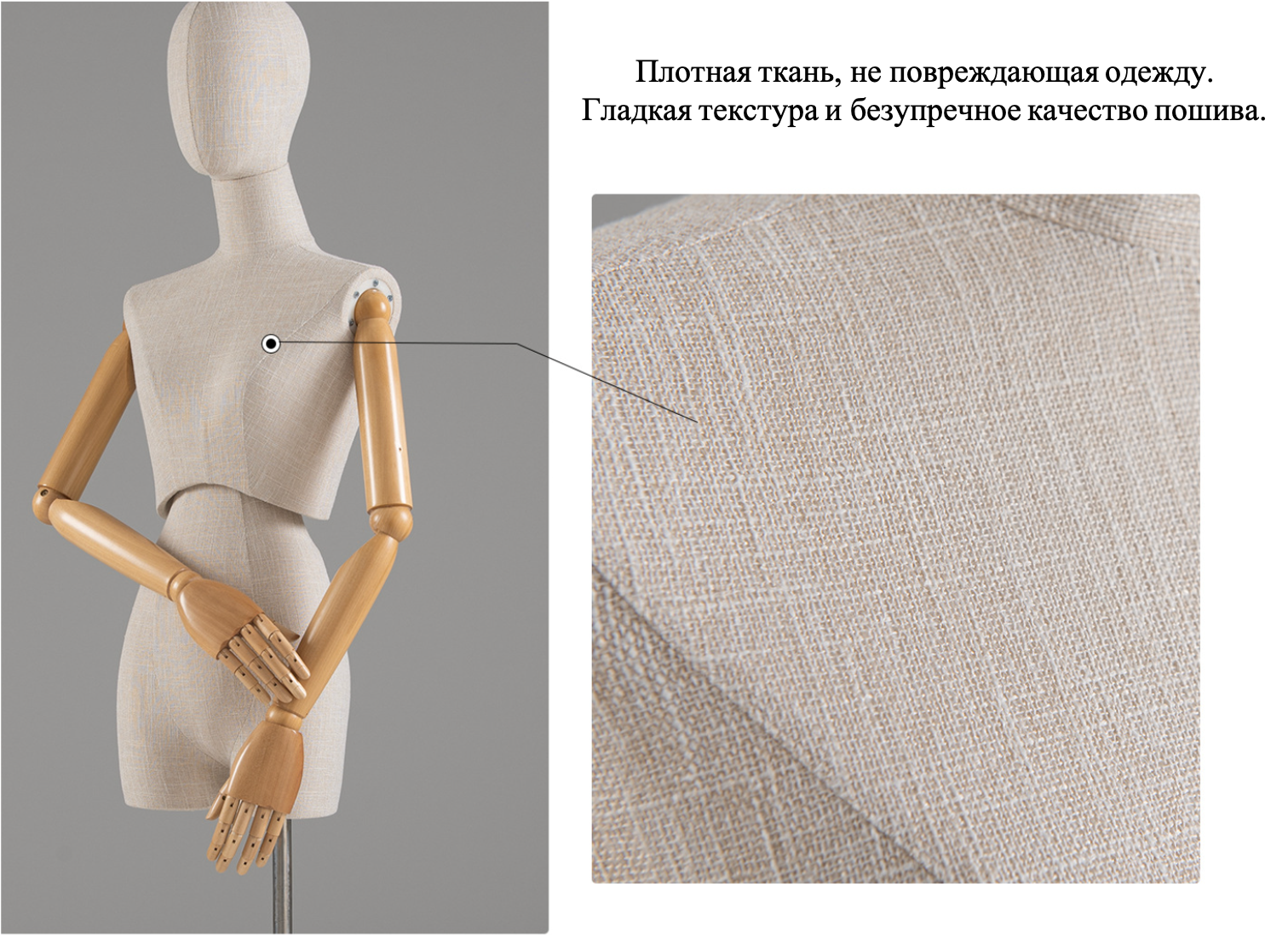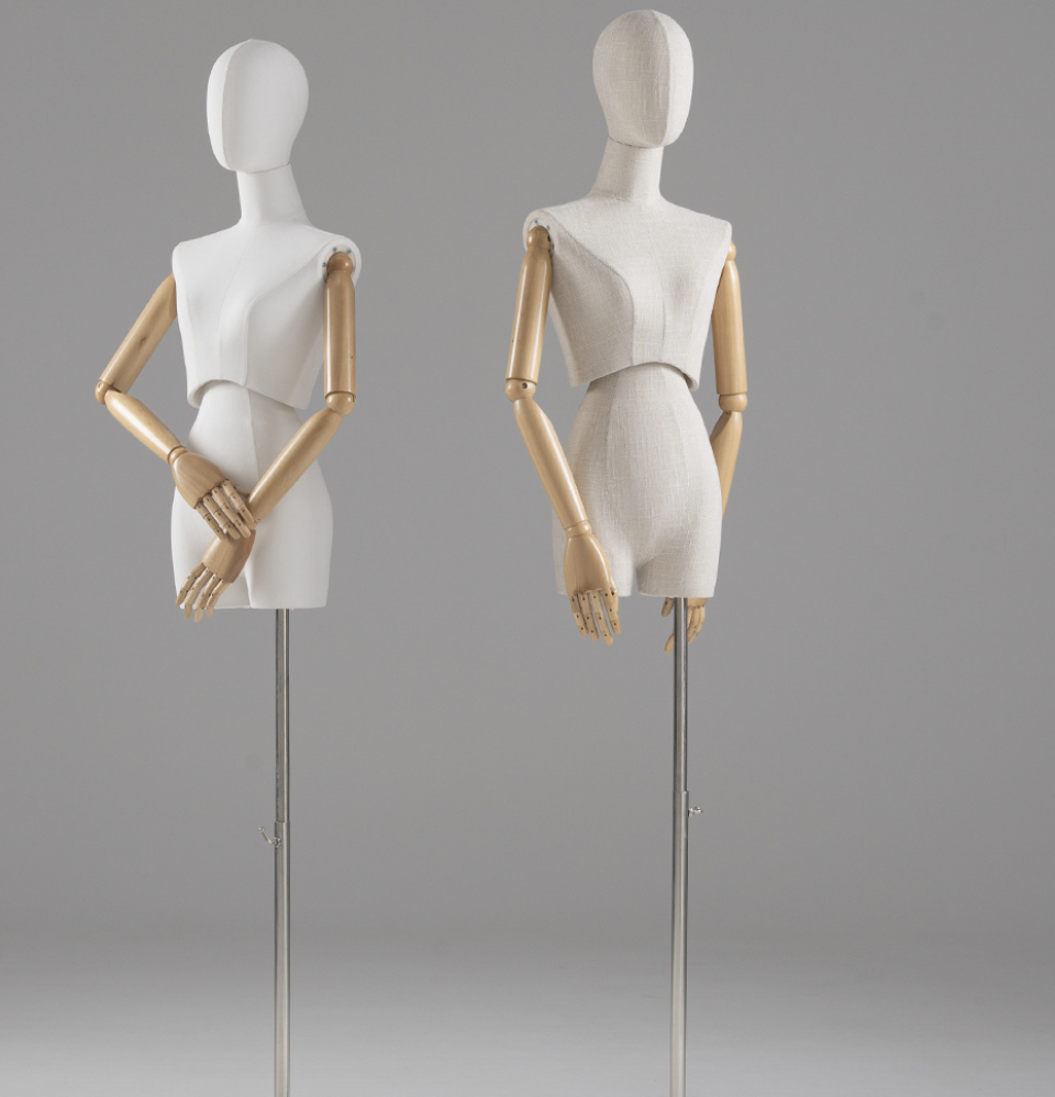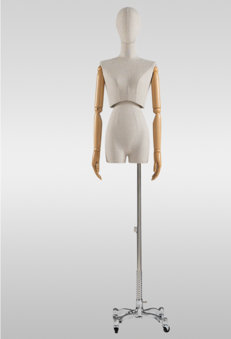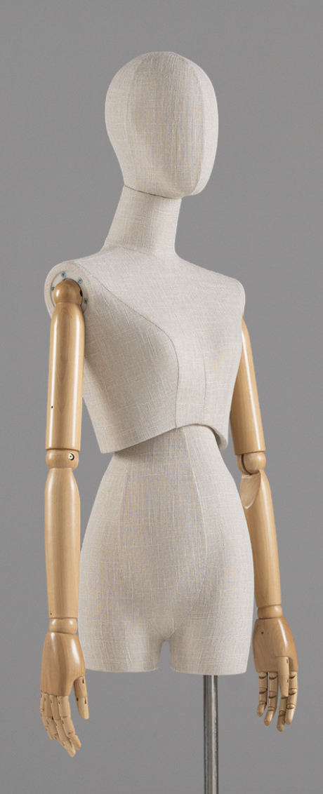 Женский манекен торс в стиле ретро, обтянутый льняной тканью, с подвижными деревянными руками и деревянной головой— идеальное решение для магазинов одежды, шоурумов, музеев и витринных экспозиций. Элегантный винтажный образ подчёркивает посадку одежды и аксессуаров, подходит для классических и дизайнерских коллекций. Плотная ткань, не повреждающая одежду.